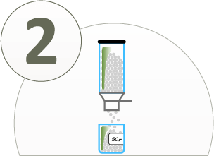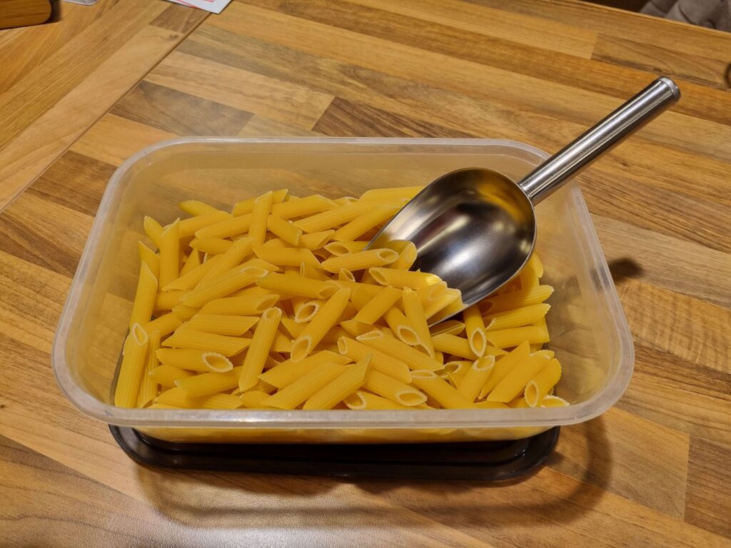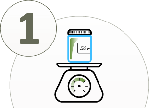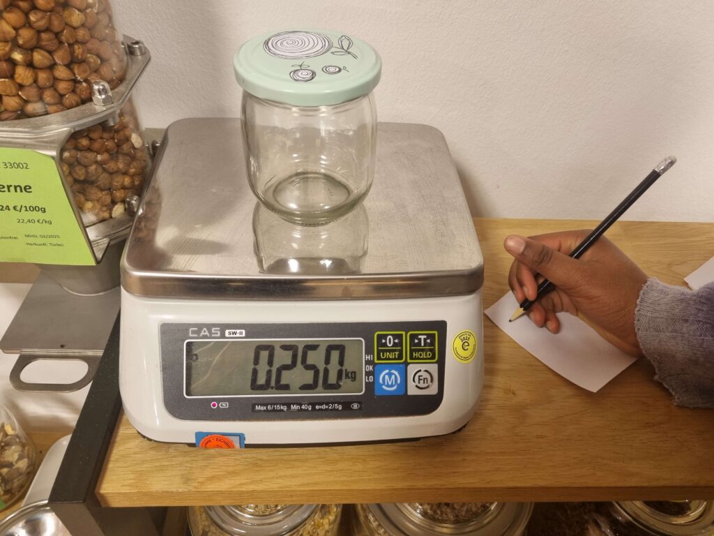 leere Behälter mit Verschluss wiegen und Gewicht notieren (Aufkleber oder Folienstift)